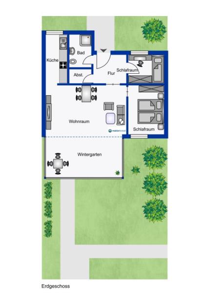Flur, Kochen / Wohnen / Essen, Eltern, Kind, Abstellraum, Duschbad, Wintergarten, Terrasse