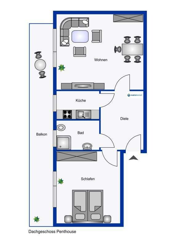 Küche, Wohn-/Essbereich, Schlafzimmer, Badezimmer, Balkon