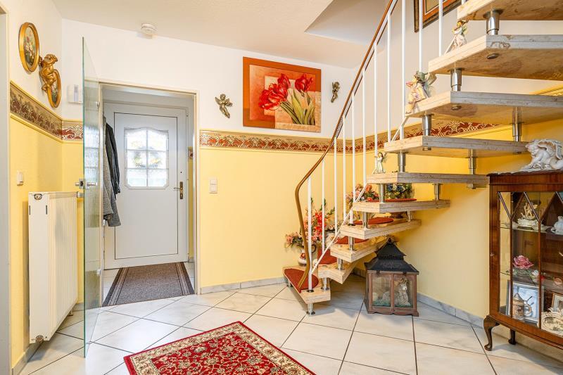 Die Wohn- und Nutzfläche beträgt ca. 101 m² und ist wie folgt aufgeteilt: Im Erdgeschoss befindet sich neben dem Eingangsbereich die geräumige Küche mit separatem Abstellraum, der Wohn- und Essbereich mit Zugang auf die Außenterrasse und das Gäste-WC. Über eine massive Treppe gelangen Sie in das Dachgeschoss des Hauses. Hier befinden sich drei Schlafzimmer und das Badezimmer mit Badewanne und Dusche. Der Spitzboden bietet reichlich Abstellfläche.