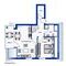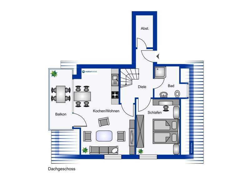 Flur, Wohnen / Essen / Kochen, Schlafen, Duschbad, Abstellraum, Balkon
