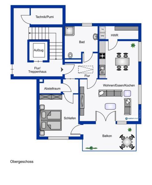 Flur, Essen / Wohnen, Küche, Schlafzimmer, Hauswirtschaftsraum, Abstellraum, Bad, Balkon