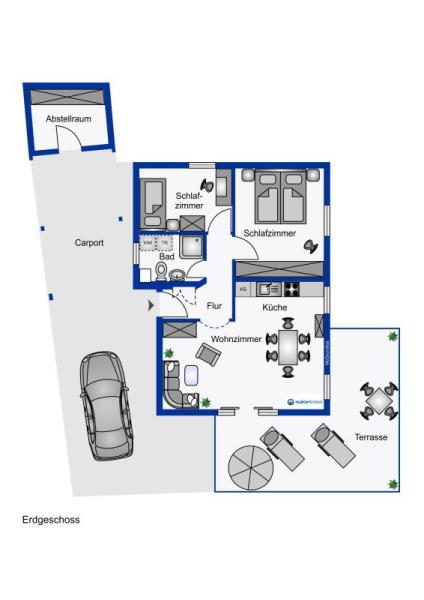Flur, Wohnen / Kochen / Essen, 2 Schlafzimmer, Duschbad, Terrasse, Carport mit Abstellraum
