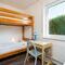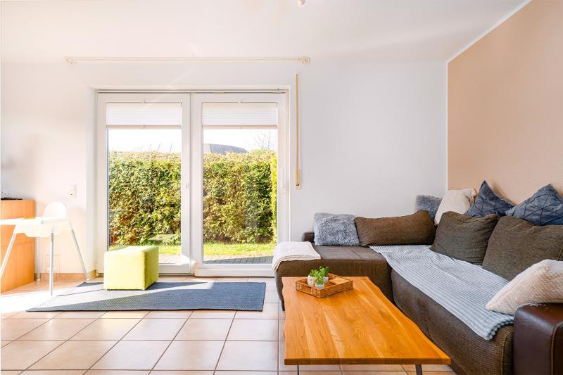 Neben der geräumigen Wohnküche mit Ausgang (große Schiebetür) zur Sonnenterrasse besticht der Grundriss außerdem durch das Duschbad sowie zwei weitere Schlafzimmer.