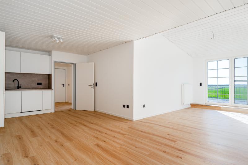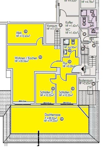 Flur, Wohnen / Kochen, 2 Schlafzimmer, Duschbad, Dachterrasse