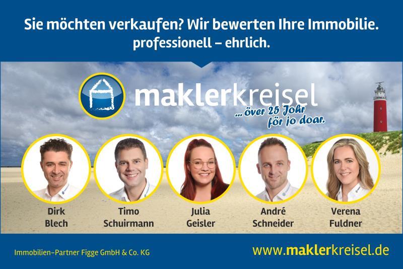 Im attraktiven Nordseeheilbad Bensersiel bieten wir Ihnen diese schöne Ferienwohnung in der bekannten Ferienwohnanlage "Inselblick" provisionsfrei zum Kauf an. Diese im Dachgeschoss befindliche Wohnung Nr. 6 (lt. Aufteilungsplan, MEA 130,79/1000stel) mit ca. 97 qm Wohnfläche besticht durch zwei Schlafzimmer, einem Duschbad, einer geräumigen Wohnküche aber vor allem durch eine großzügige und zum Süden ausgerichtete Dachterrasse mit herrlichem Ausblick über Wiesen und Felder bis hin zur Esenser Kirchturmspitze! Der schöne Sandstrand, der Hafen, sowie die Restaurants, Boutiquen, die Nordseetherme und der Supermarkt mit Bäckerei sind fußläufig zu erreichen.