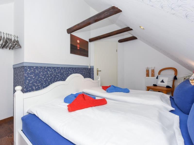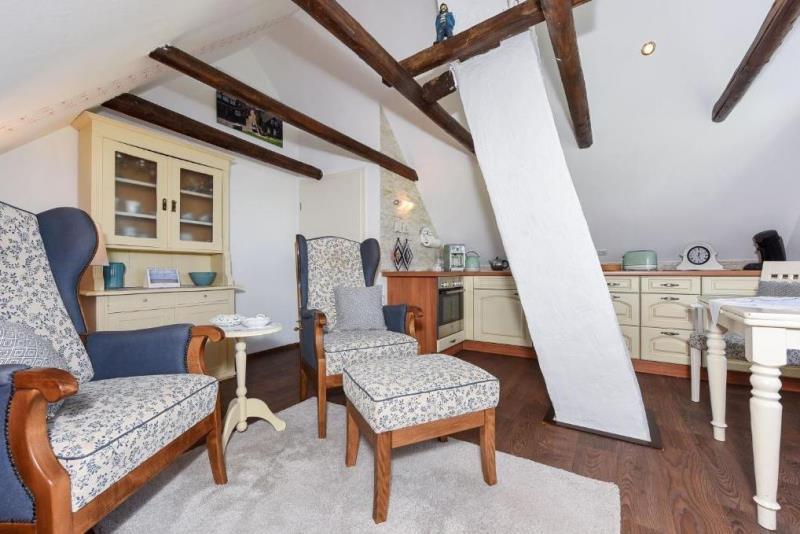 Beide Einheiten verfügen jeweils über ein Schlafzimmer und ein Badezimmer. Die Erdgeschosswohnung bietet darüber hinaus ein separates Wohnzimmer sowie eine eigene Küche. Die Oberwohnung – mit freigelegten Kehlbalken – besticht durch eine geräumige Wohnküche, von der aus Sie einen herrlichen Blick über den Hafendeich in Richtung Nordseeinseln genießen können.