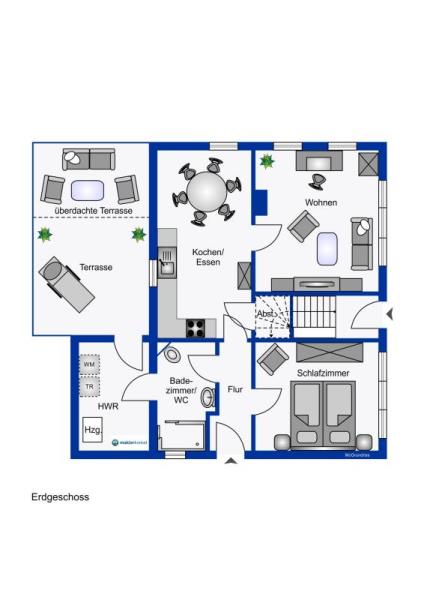 Flur, Wohnen, Essen / Kochen, Schlafzimmer, Duschbad, HWR, überdachte Terrasse