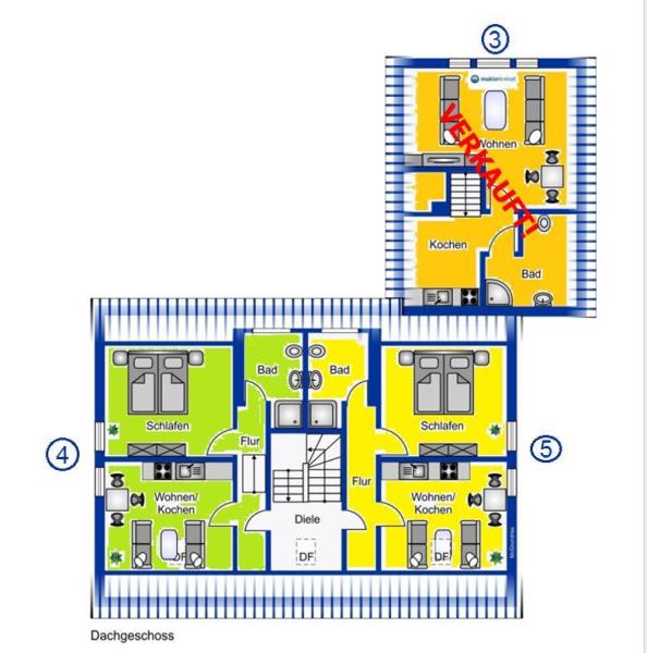 Des Weiteren stünde optional auch die Ferienwohnung Nr. 4 im Dachgeschoss zur Verfügung. Der Grundriss ist identisch, ebenfalls ohne Einbauküche, dieser Einheit ist jedoch zusätzlich der Spitzboden zugeordnet und kann für 95.000EUR erworben werden.