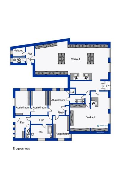 Die Verkaufsfläche im Erdgeschoss mit großen Schaufenstern (und Außenmarkisen) bietet auf ca. 170 qm Nutzfläche eine gewisse Flexibilität, sodass der Grundriß bei Bedarf auch in zwei verschiedene Vertriebsarten / Verkaufssortimente eingeteilt werden könnte.