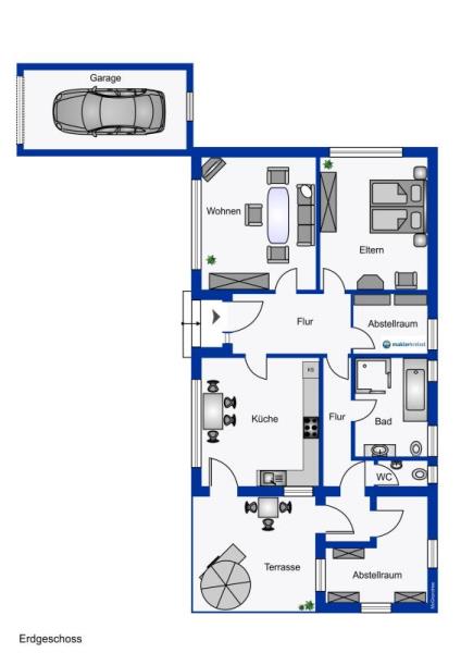 Flur, Küche, Wohnzimmer, Schlafzimmer, Lagerraum, Badezimmer, Gäste WC, Abstellraum