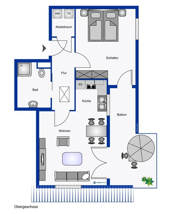 Obergeschoss: Flur, Küche, Wohn-/Esszimmer, Badezimmer, Schlafzimmer, Abstellraum, Balkon